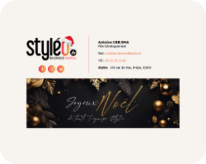 Transformez chaque email en vecteur de communication festive avec des signatures personnalisées aux couleurs de Noël. Notre équipe de communication digitale crée des signatures HTML, fixes ou animées (GIF) qui affichent vos vœux, annoncent vos fermetures ou redirigent vers vos offres spéciales.​