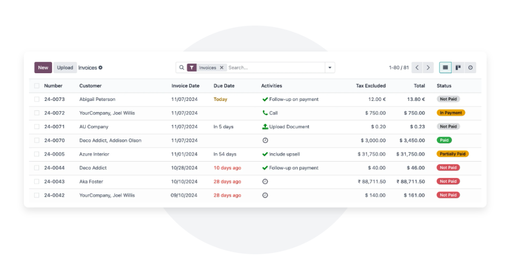 L'archivage devient un non-sujet. Odoo stocke vos factures de façon sécurisée et conforme aux obligations légales. Lors d'un contrôle fiscal, vous pouvez retrouver n'importe quelle facture en quelques secondes. Plus besoin de fouiller dans des dossiers papier ou des arborescences de fichiers.